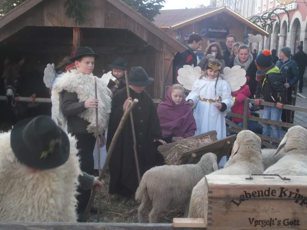 Seit ein paar Jahren bauen Rudolf Hief sen. und Toni Off während dem Murnauer Christkindl Markt eine lebendige Krippe auf. Kinder sind Maria und Josef und passen auf das Jesuskind auf. Hirten achten auf die Schafe und Flötenspieler musizieren. Die Krippe neben der Mariensäule ist der Anziehungspunkt für Jung und Alt. Bei dieser Spendenaktion für Kunterbunt e.V. kamen 497,00 Euro zusammen.