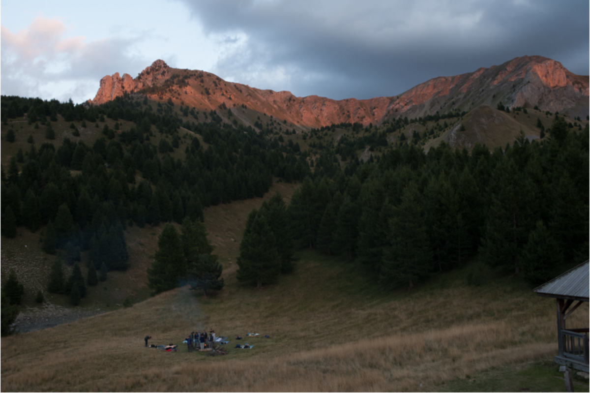 Bauch, entzünden ein Feuer. Noch kurz glühen die Berge, dann wird